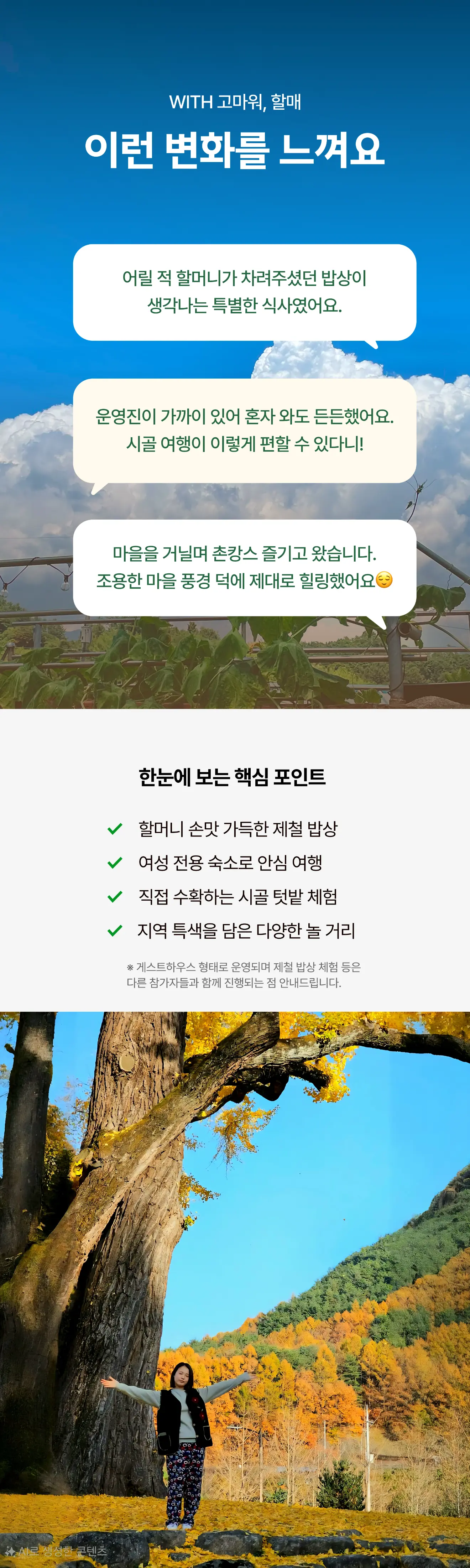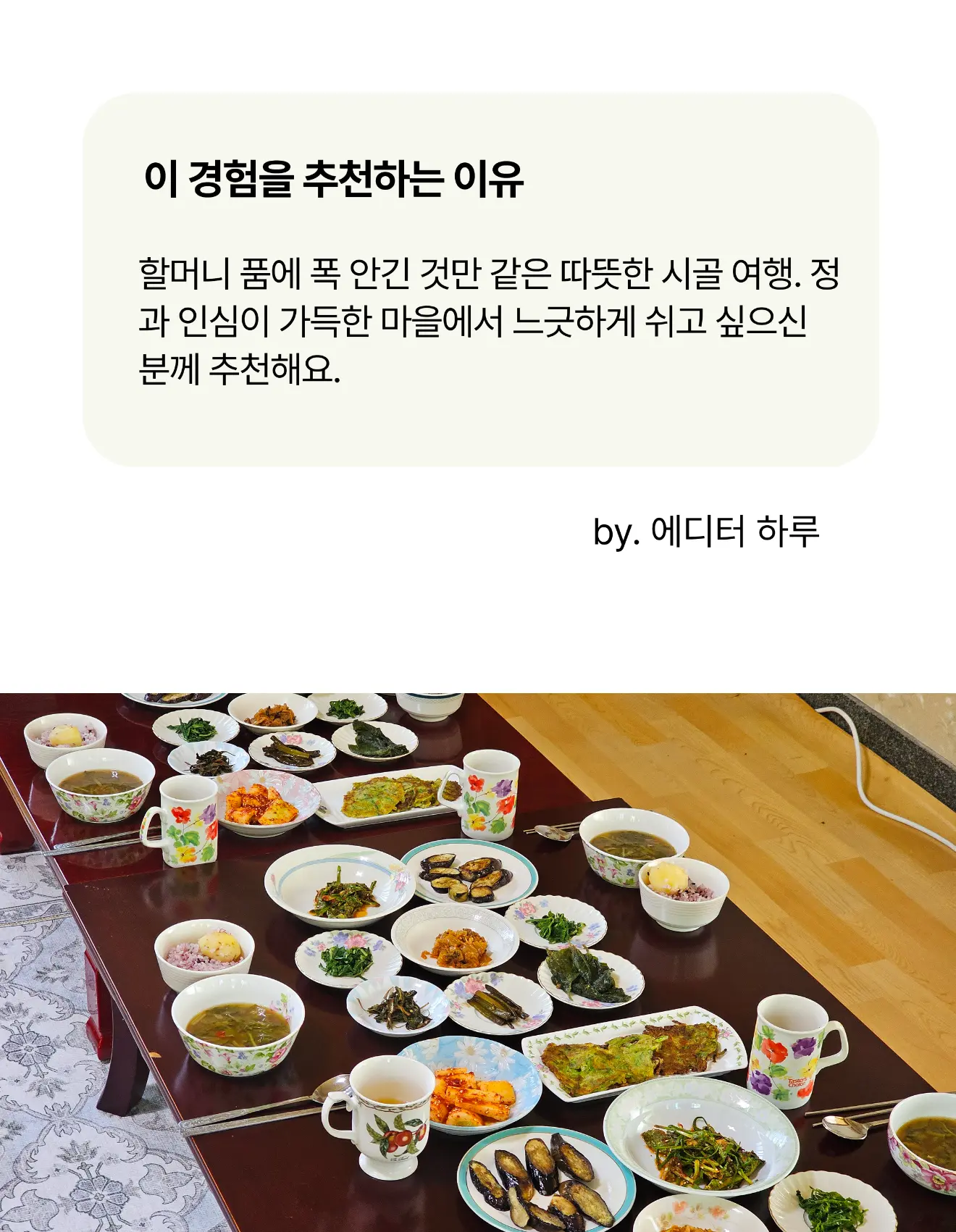 친구들과 함께 지친 마음을 힐링하고자 신청했습니다. 시골 정취가 물씬 담긴 숙소에서 몸빼바지도 입고, 평상에서 고기도 구워 먹으며 재밌는 추억을 만들었습니다. 아침 밥상에서 친절하신 운영진들과 새로운분들을 만나게 되어 재밌고 신선한 경험이었습니다!☺️🩵🩵