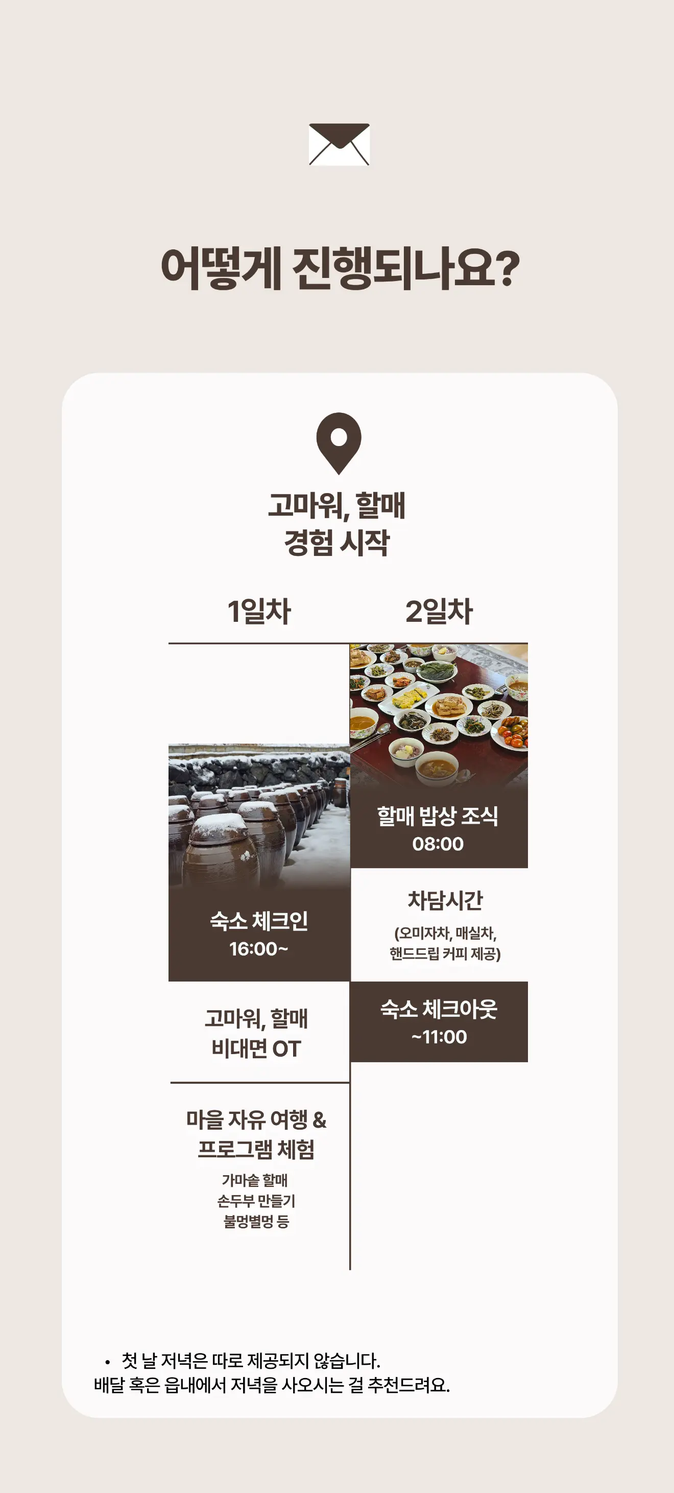 해당 경험은 ‘고마워, 할매’만의 지역살이 프로그램입니다. 참가자는 필수 프로그램인 ‘할매 밥상(조식)’에 꼭 참여해 주세요.