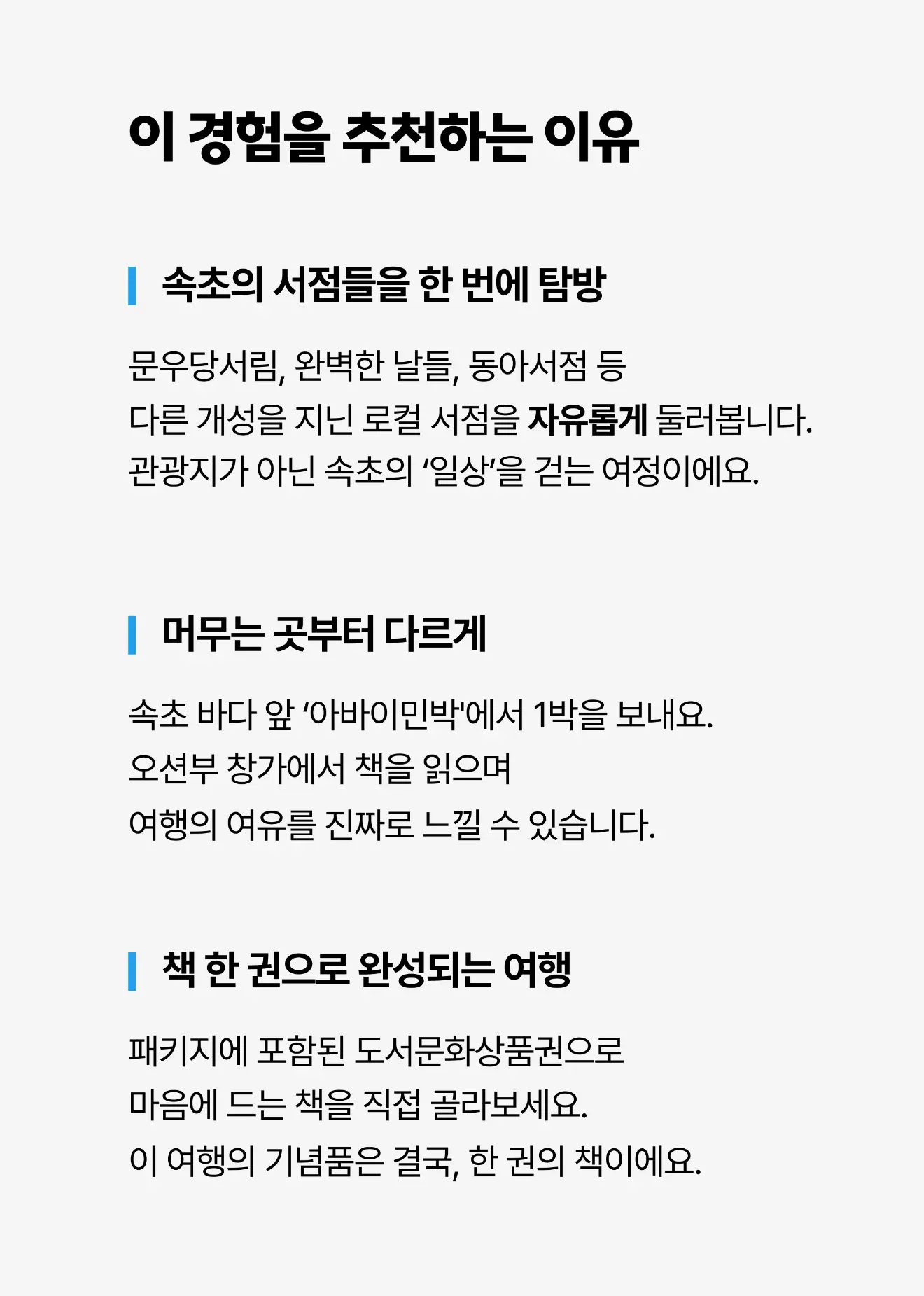 "여행지에서 책 한 권 읽을 여유, 가져본 적 있나요?" 속초의 바다와 서점을 오가며, 조용히 나를 돌아보는 시간을 가져보세요.