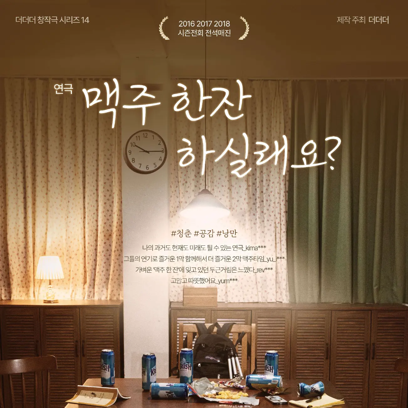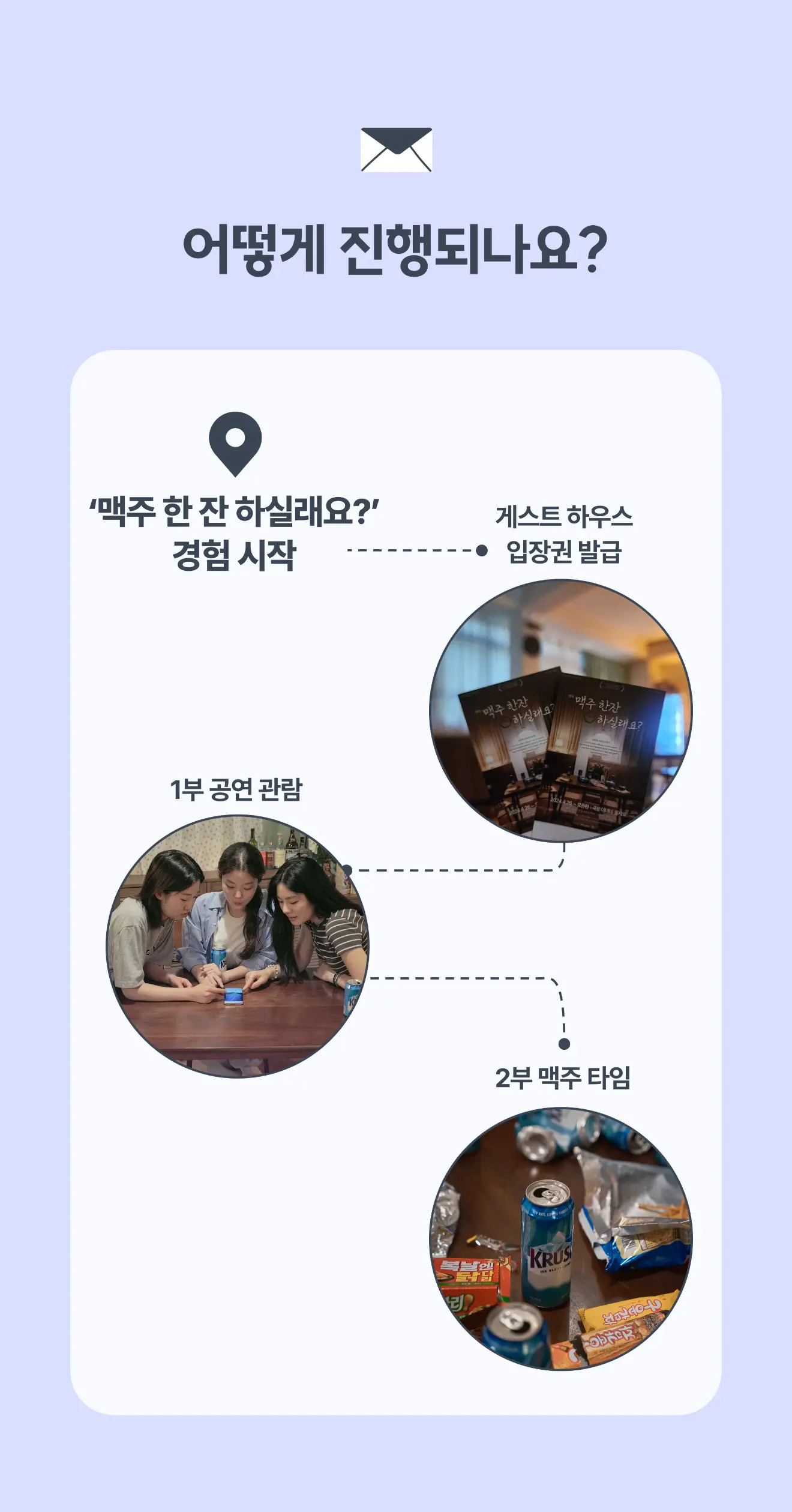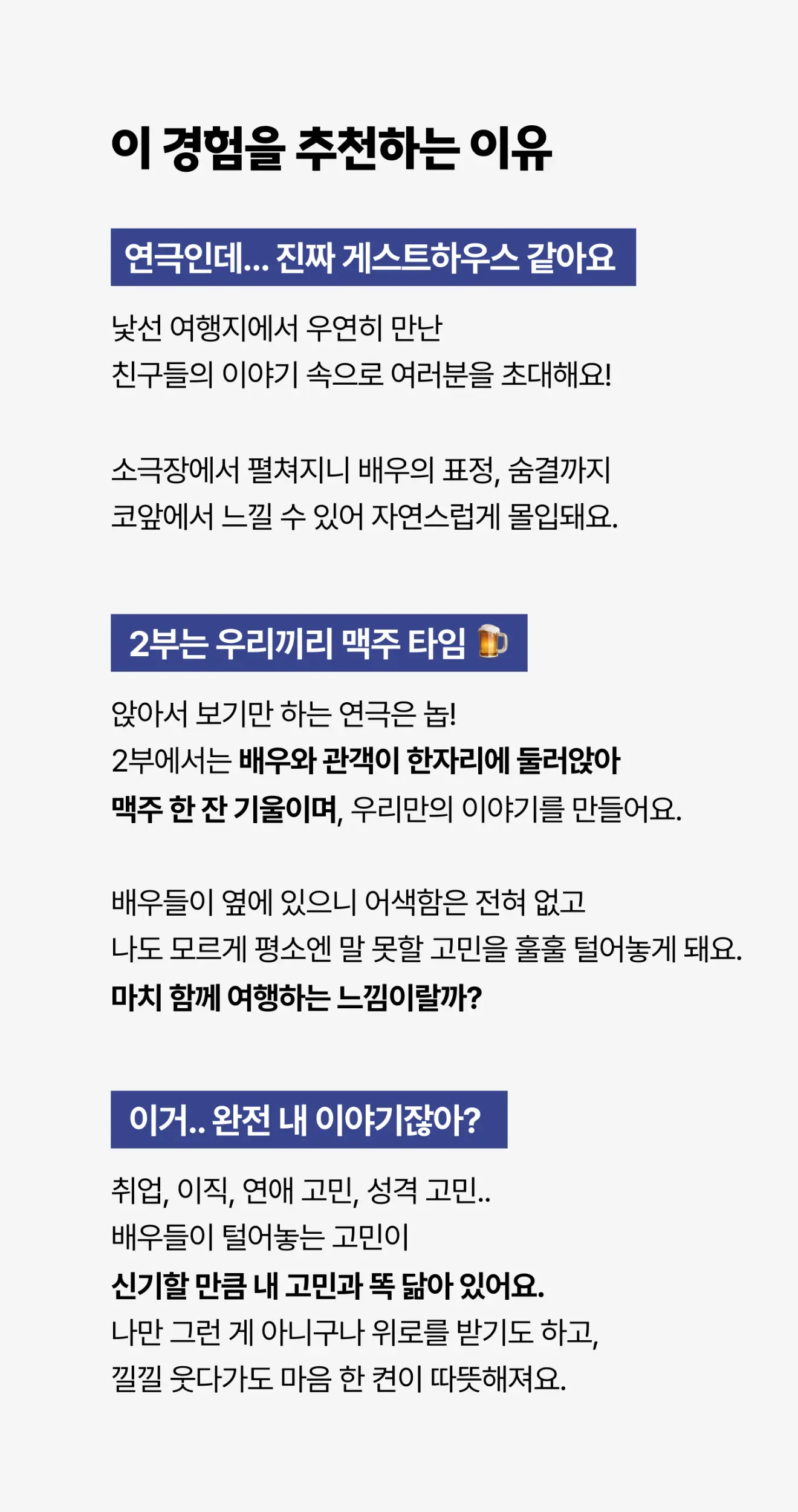 맥주 마시며 편하게 이야기 나누는 연극이에요.