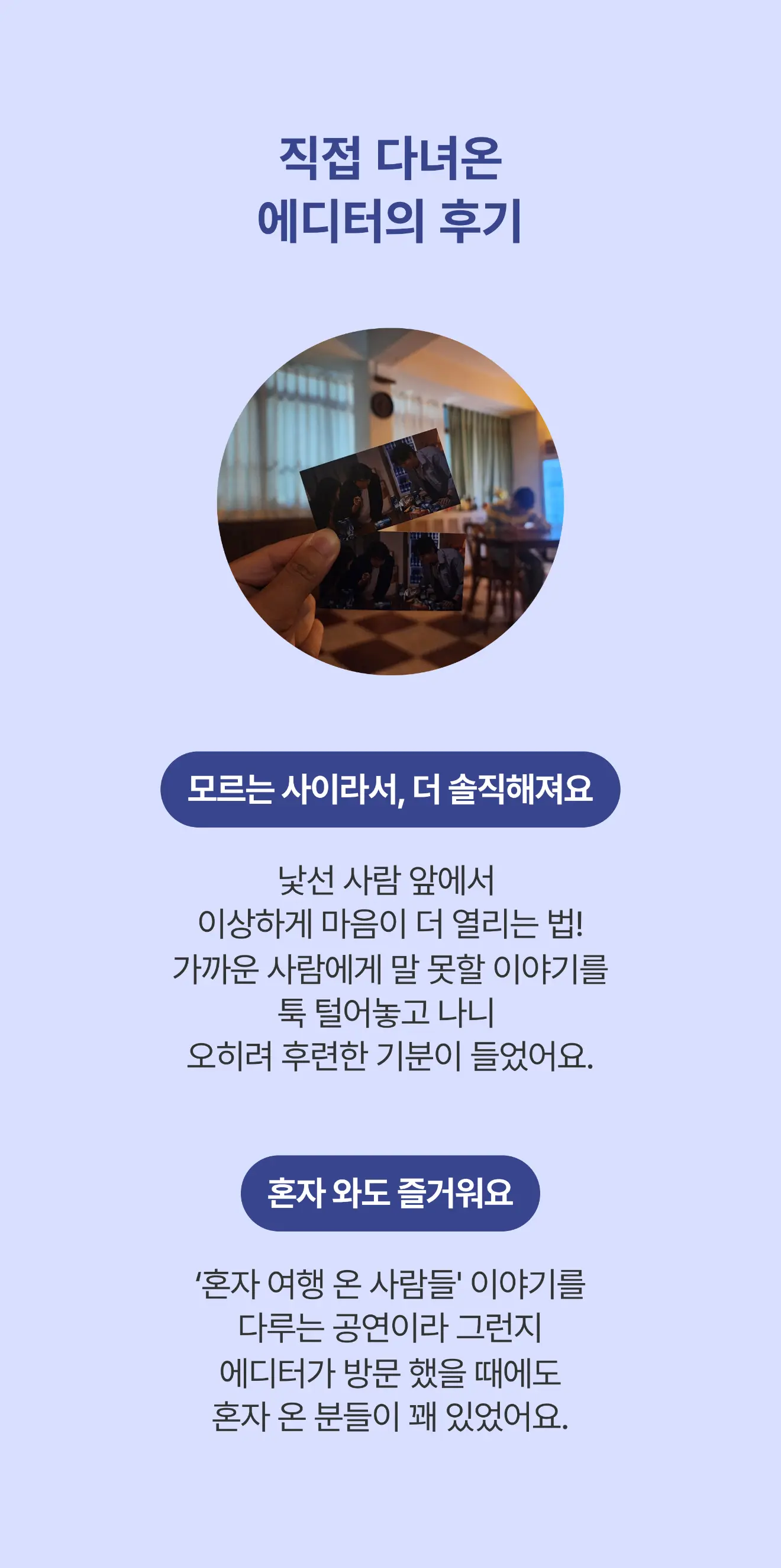 본 공연은 일반적인 극장이 아닌 극의 배경(게스트하우스로 꾸며진)스튜디오에서 진행됩니다.
