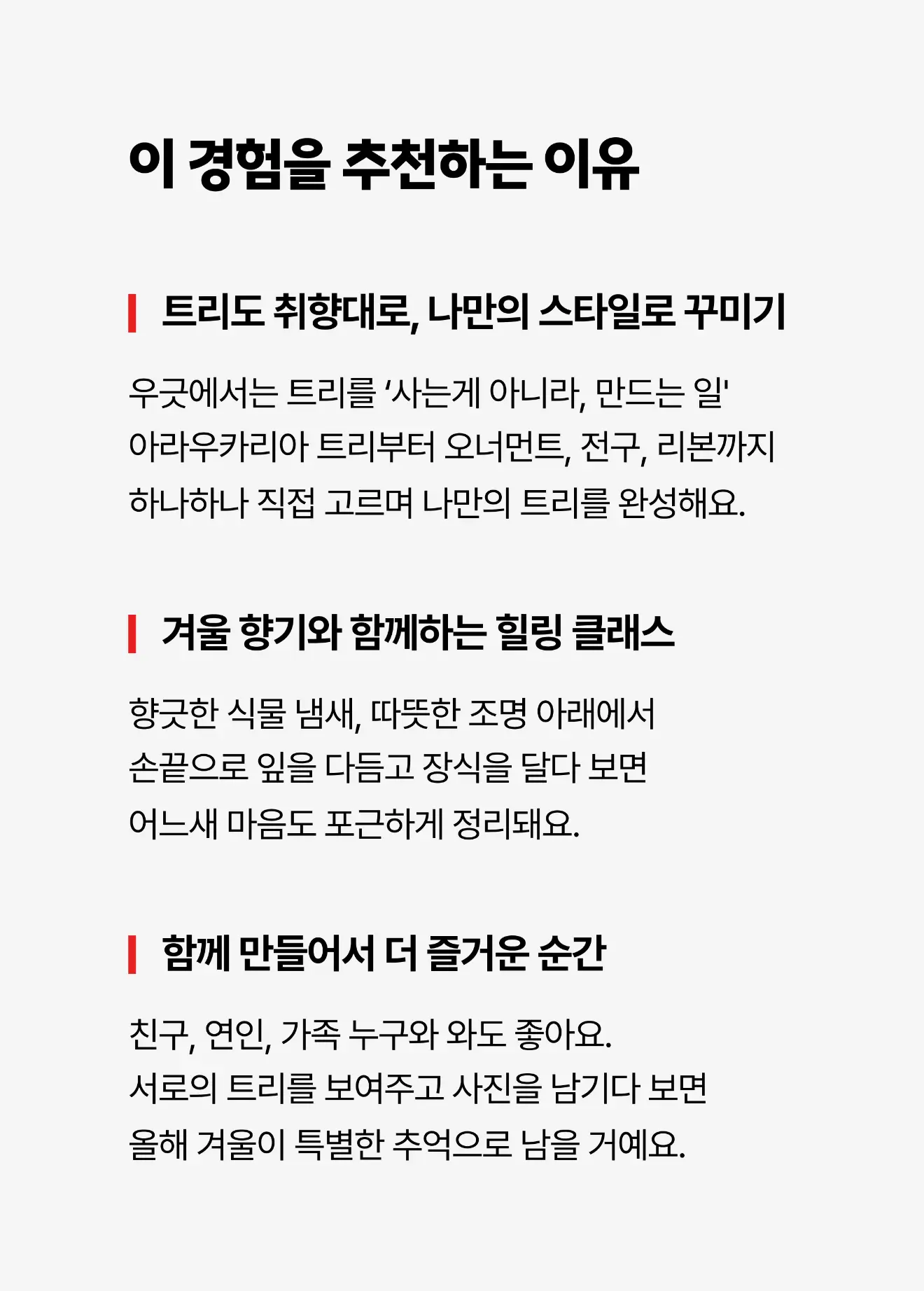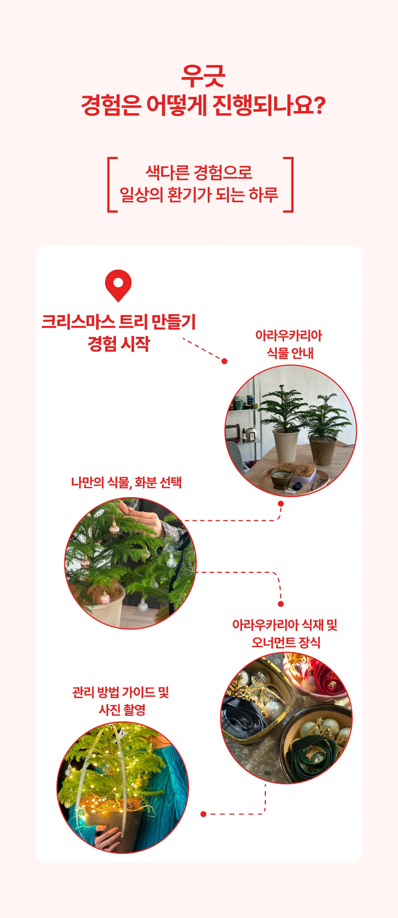 아라우카리아 생화부터 오너먼트, 전구, 리본까지