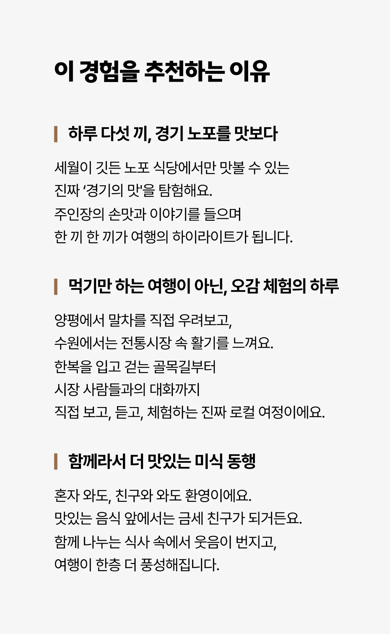 하루가 짧게 느껴질 만큼, 경기의 맛은 깊습니다.