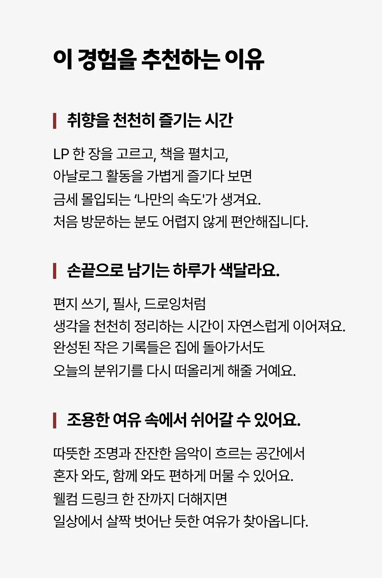 조용한 공간에서 머무르는 경험이에요. 다른 이용자분들을 위해 큰 소리 대화는 삼가 주세요.