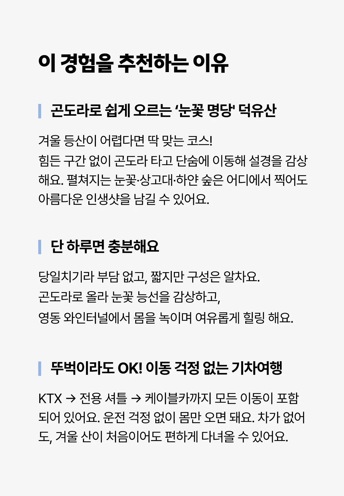 곤도라만 타면 단숨에 정상 근처까지 올라가서, 짧은 산행으로도 겨울 산의 하이라이트를 만나게 돼요.