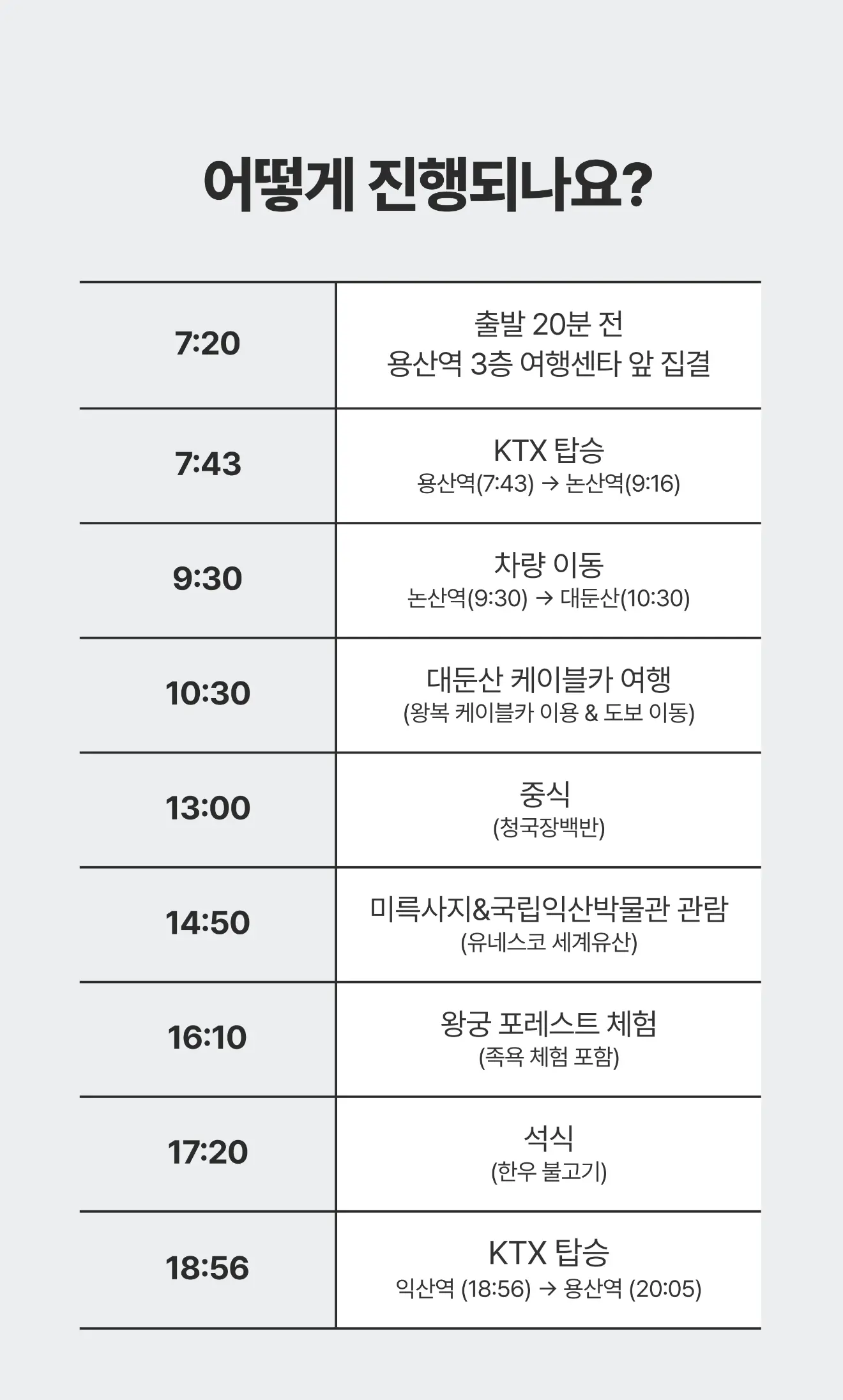 열차(또는 버스) 시간은 변경될 수 있으며 사전에 연락드립니다.