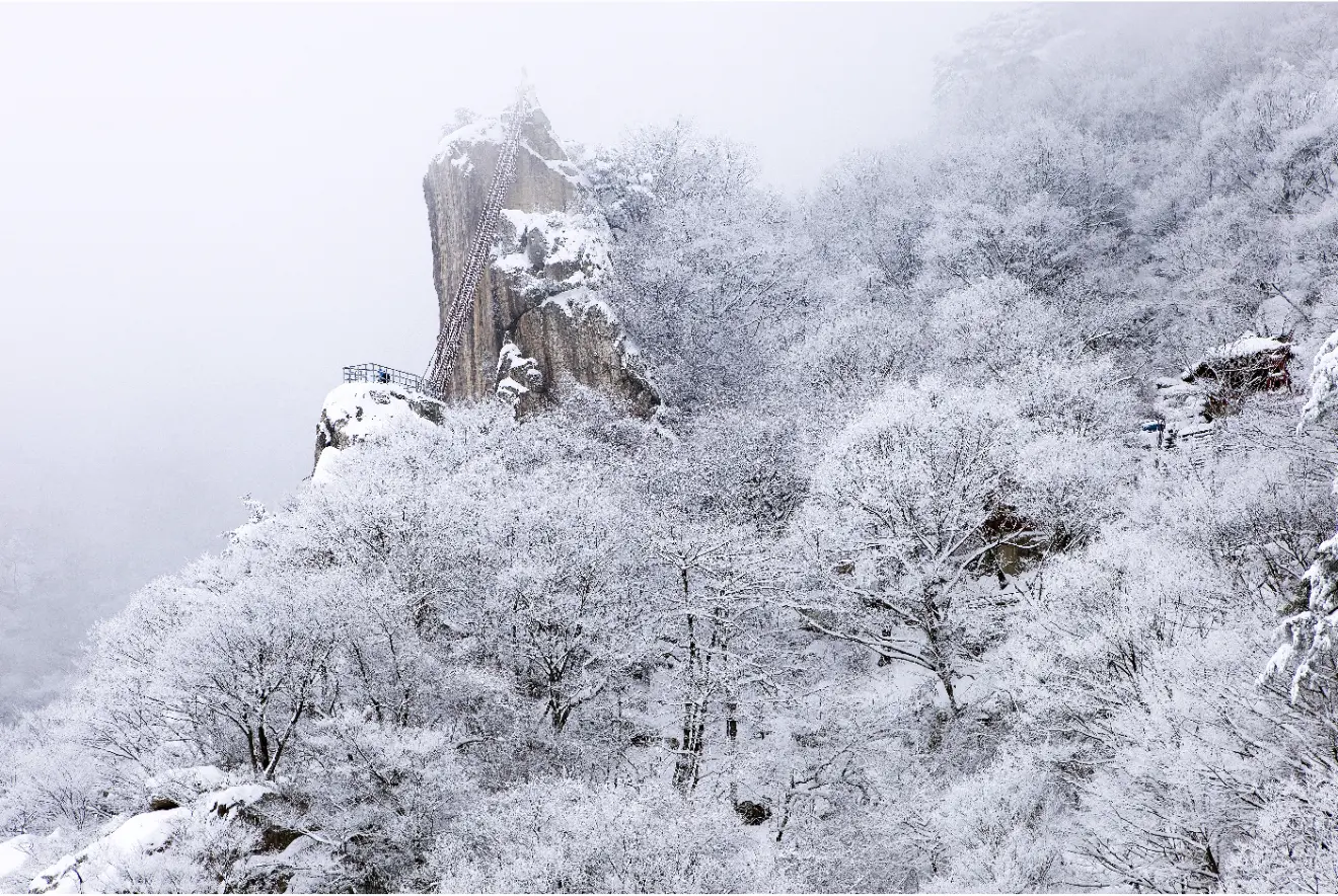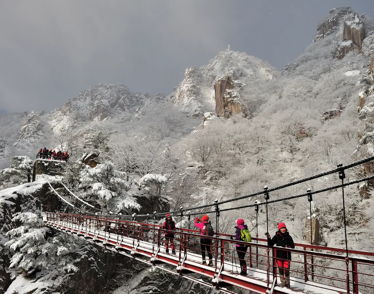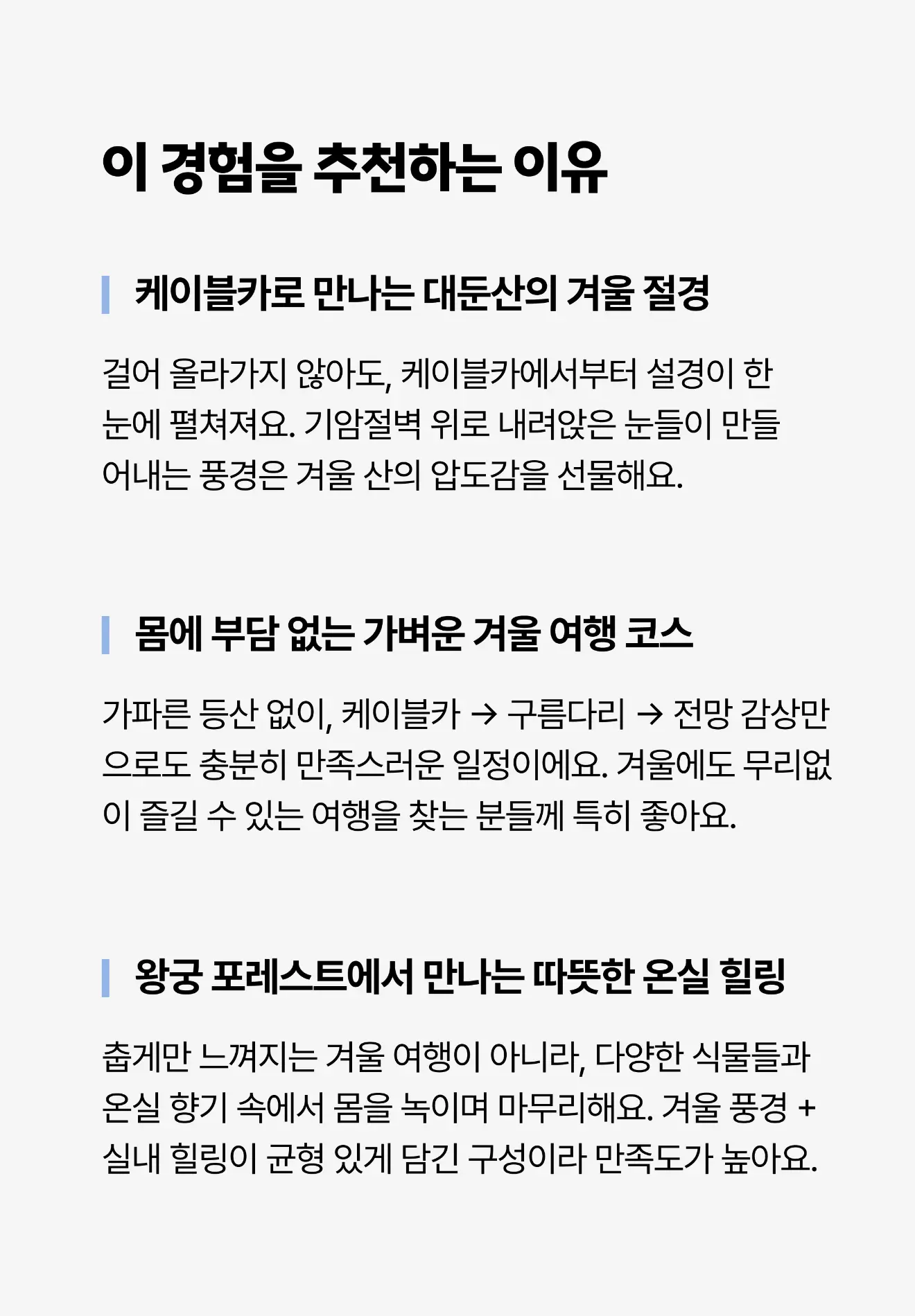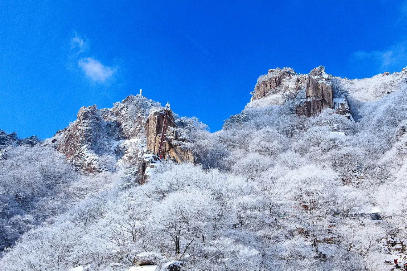 케이블카를 타고 올라가면, 눈이 내려앉은 능선과 기암절벽이 가까이 펼쳐져 시원한 겨울 풍경을 그대로 느낄 수 있어요.