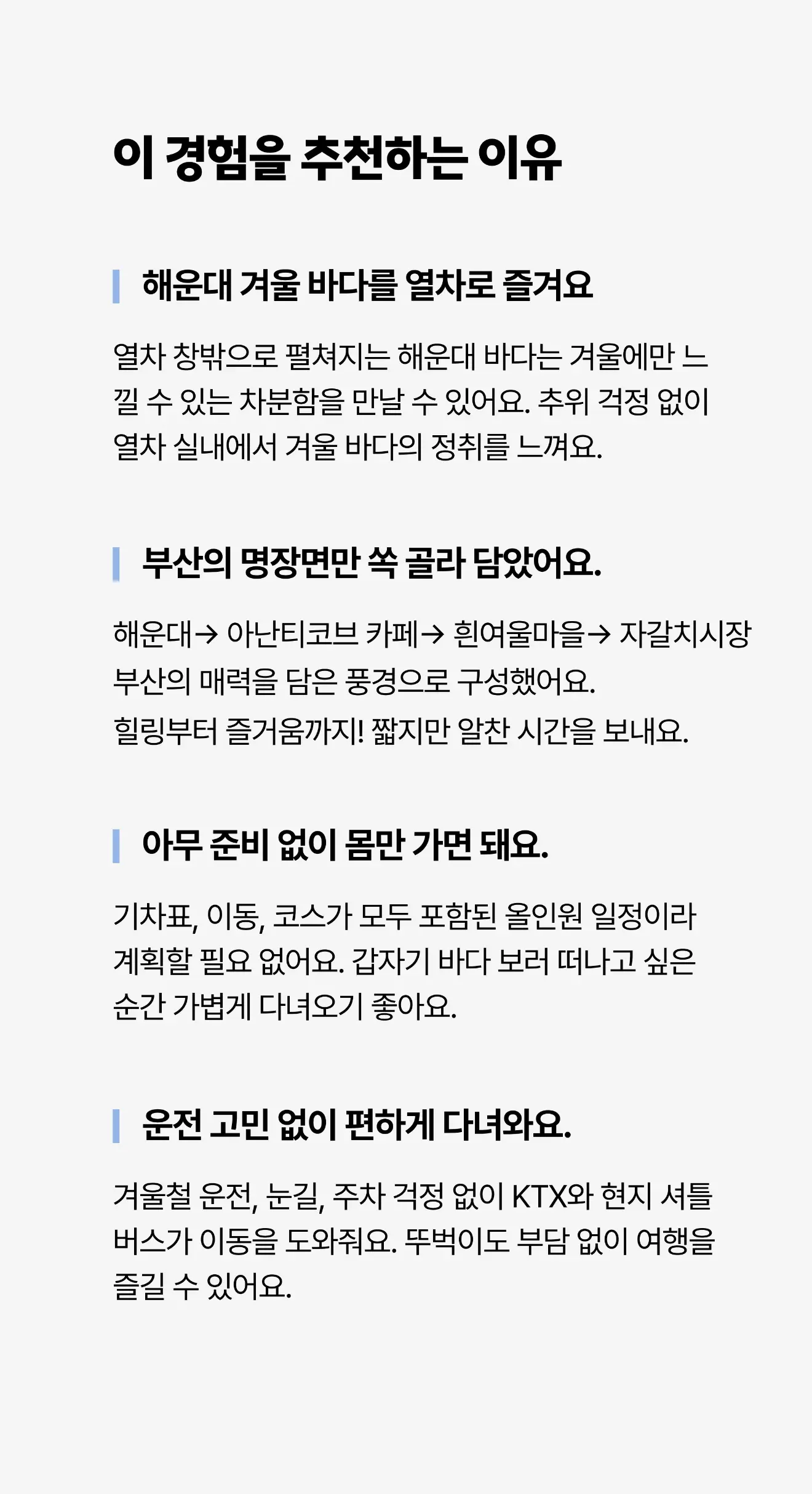 기분 전환이 필요한 날엔, 해운대 겨울 바다부터 자갈치 시장까지 부산 로컬의 매력을 만나요.