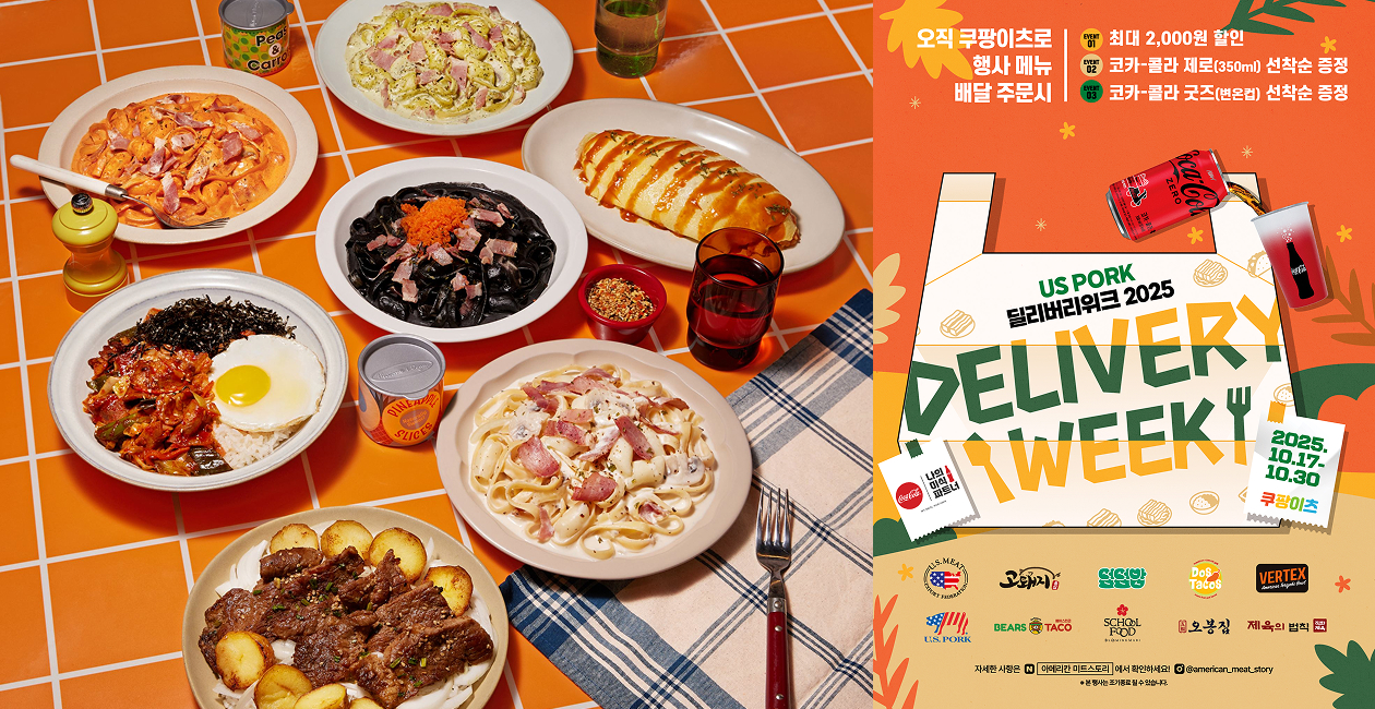 다시 돌아온 배달 축제! 고품질·고단백 미국산 돼지고기와 함께하는 2주간의 맛있는 여정, 2025 딜리버리위크 포크편이 시작됐어. ‘오봉집’, ‘스쿨푸드’, ‘덮덮밥’ 같은 친숙한 전국 맛집 480여 곳이 참여한다고 해. 평소 즐겨 먹는 제육볶음, 덮밥, 타코와 같은 돼지고기 메뉴를 최대 2,000원 할인된 가격에 즐길 수 있지. 거기다 코카-콜라 제로 350ml랑 코카-콜라 변온컵 굿즈까지 제공한다고! 가성비에 솔깃해진다랭🙈