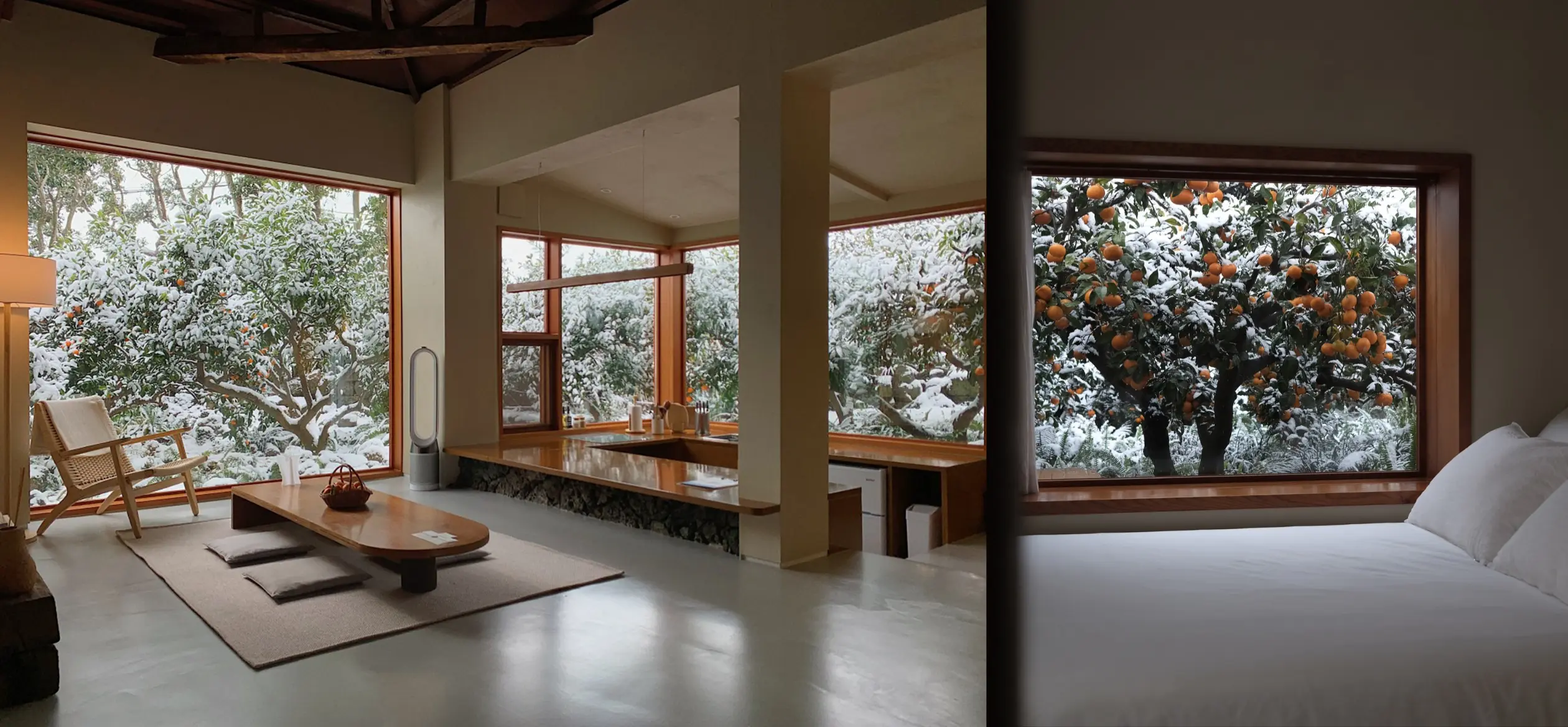 50년 된 옛 가옥을 다듬어 민든 독채 스테이야. 거실을 둘러싼 창밖으로 조경사였던 아버지의 손길이 닿은 정원과 겨울에도 푸른 귤 밭이 펼쳐져. 눈이 내리는 날이면 흰 눈과 녹음, 주황 과실의 조화가 보다 더 아름답게 느껴질 거야. 지내는 동안에는 제주 재료로 만든 차를 마실 수 있고 요가와 명상을 위한 공간도 마련되어 있어. 사랑하는 사람과 함께 특별한 계획 없이 쉬는 일 그 자체에 집중하기 좋은 공간이야.