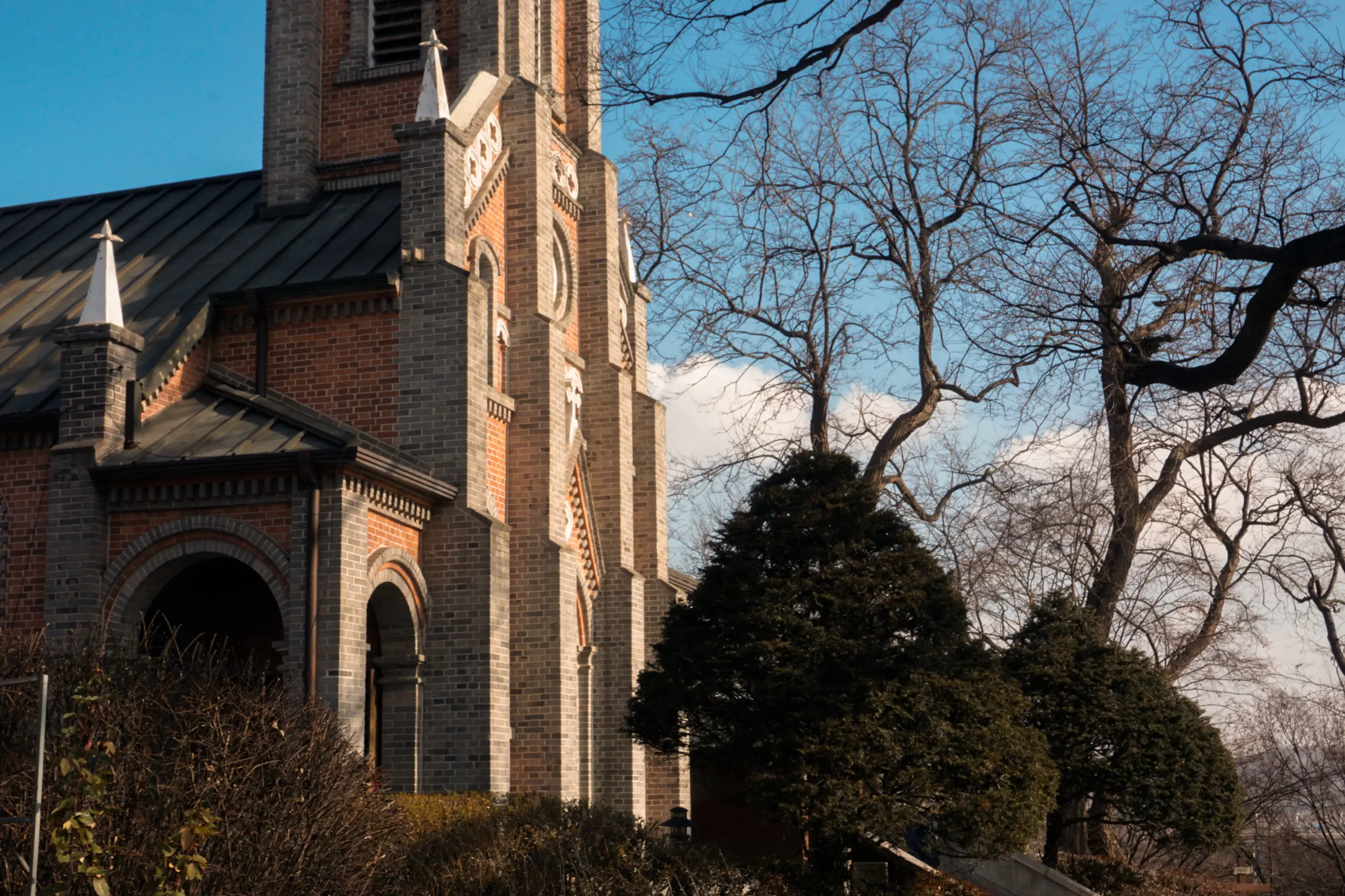 갈색 벽돌의 고딕 양식 성당은 주변 나무들이랑 자연스럽게 어우러져서 마치 동화 속 배경처럼 보이기도 해. 뾰족한 첨탑 덕분에 멀리서도 존재감이 확실하고, 성당 주변에는 350년 넘게 자리를 지켜온 국가 보호수 네 그루가 조용히 풍경을 완성하고 있어.
