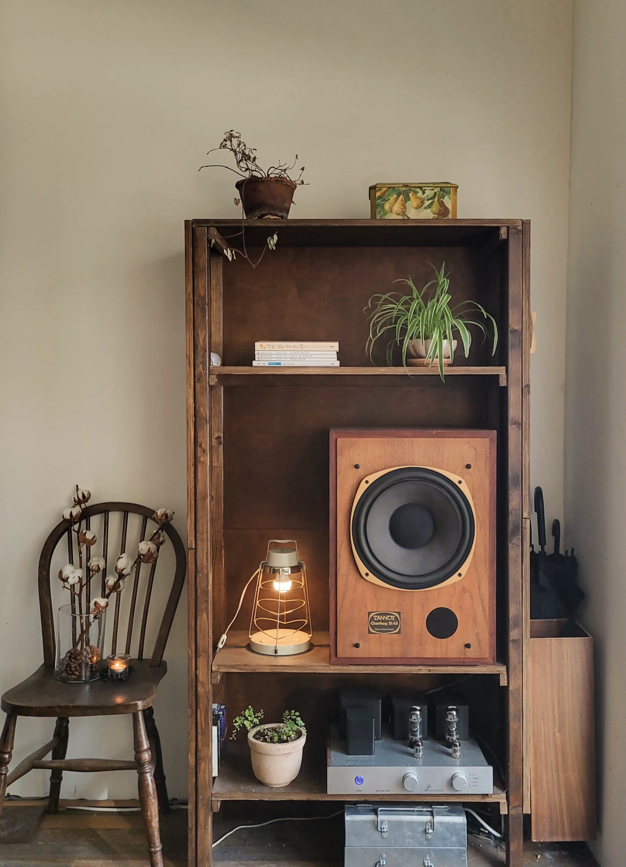 오래된 목재 가구와 오브제, 깊은 색감의 책장이 공간의 분위기를 단단하게 잡아줘. 대형 스피커에서 흐르는 음악도 과하지 않고, 독서나 대화를 방해하지 않는 선이라 편안해.