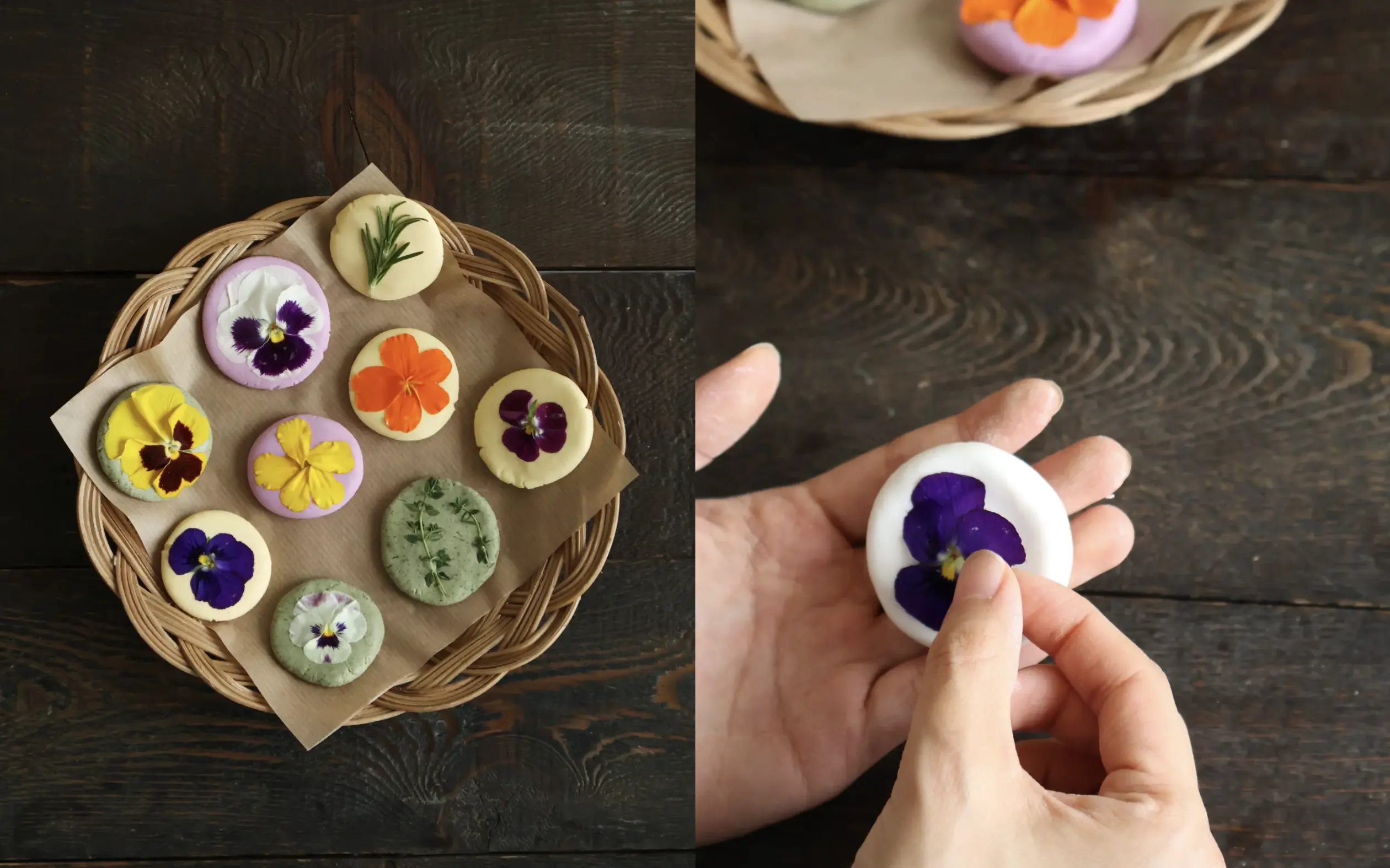 농약 없이 키운 식용꽃 30송이와 유기농 쌀 반죽으로 만드는 예쁜 화전이야. 반죽은 고구마, 단호박, 쑥, 쌀로 색을 내서 보기만 해도 눈이 즐거워지지. 좋...