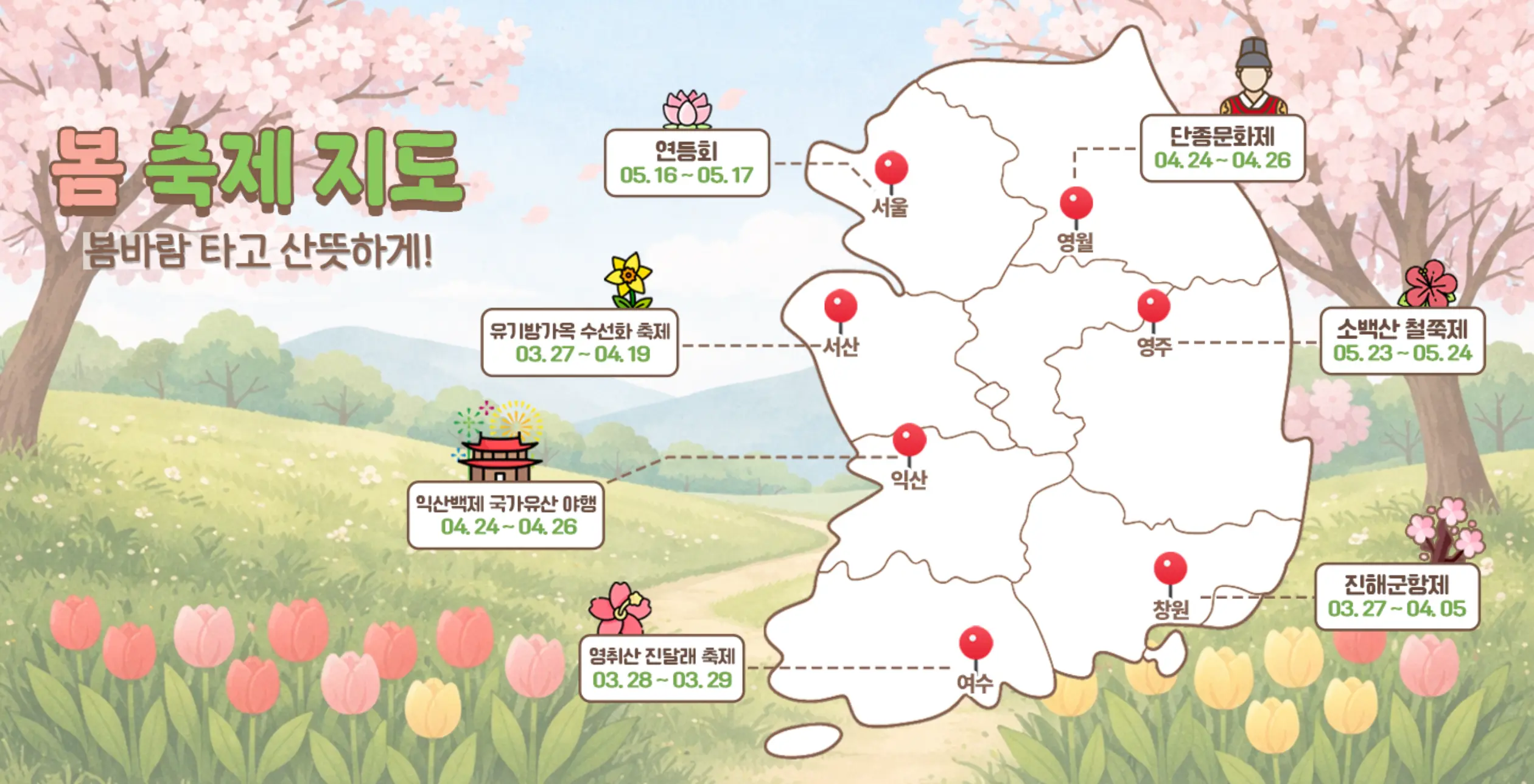 날씨가 풀리자마자 전국 지자체에서 앞다투어 축제 소식을 전하는 요즘이야. 벚꽃, 수선화, 진달래부터 각종 로컬 축제까지. 핸드폰 속에 캡처만 해두기엔 금방 잊어버리기 마련! 가내수공업을 좋아하는 에디터 제로가 3월부터 5월까지 열리는 50여 개의 전국 봄 축제 소식을 정리해왔...