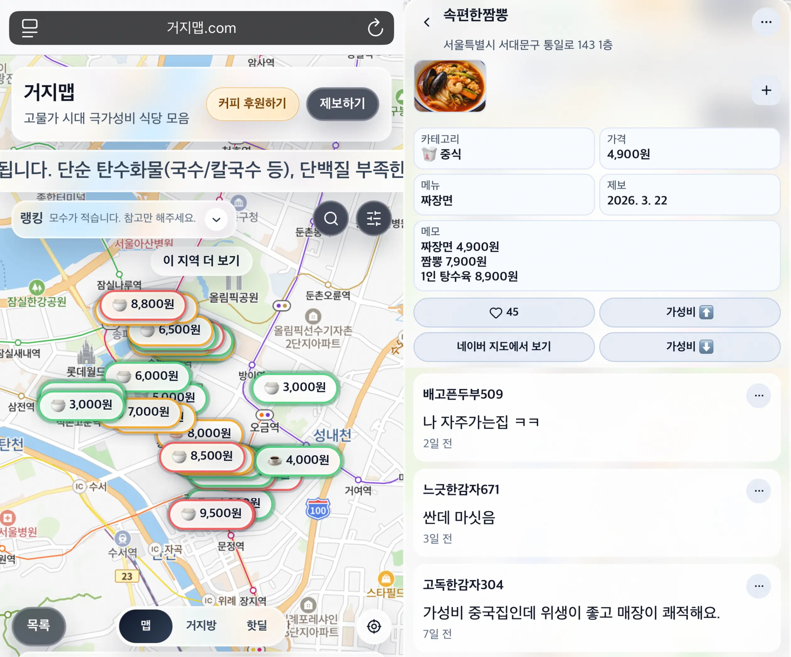 이번달 카드 값이...🫣 놀라서 내역을 확인해 보면, 범인은 대개 식비일 때가 많잖아. 올라버린 물가 탓에 어쩔 수 없긴 하지만, 조금이라도 지출을 줄일 수 있는 방법이 없을까? 이런 우리를 위한 맞춤형 지도가 등장했어. 거지맵이라는 직관적이라는 이름에서부터 느낌이 오듯, 전국의 가성비 좋은 식당만 모아놓은 맛집 지도야. 실제 가본 후기를 기반으로 사용자들이 장소를 등록하기 때문에, SNS에는 ...